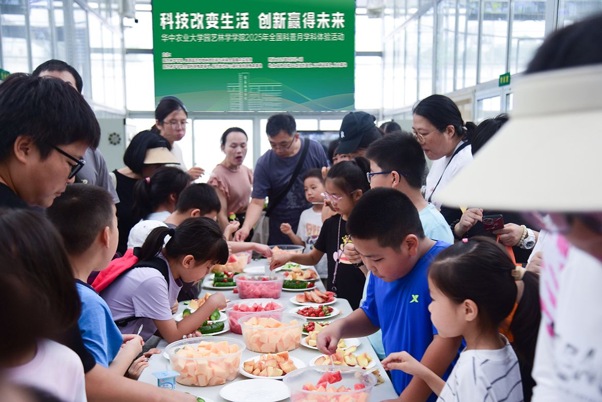 孩子们品尝着西瓜、哈密瓜、黄瓜、西红柿等新鲜蔬果,眼神里满是对脆甜口感的赞叹。家长们一边掏出手机记录,一边陪孩子品尝,“这个番茄太好吃了,就是小时候的味道”一位妈妈说道。