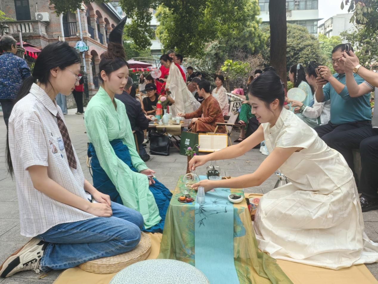茶会期间,孙佳雨、施宇涵为其他茶友冲泡紫鹃茶,并向他们详细介绍着这款茶的来源与特色。此外,同学们与其他院校的茶学学子互相学习冲泡技巧、分享茶学知识。茶会现场气氛热烈,茶友们以茶为媒,共话情长。